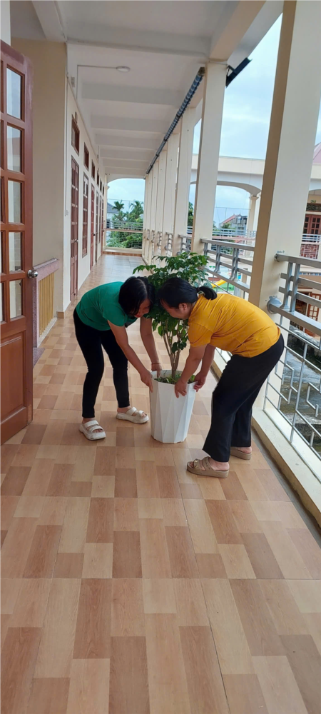 Phát quang cây xanh trong khuôn viên, chằng chống những điểm dễ gãy đổ, di chuyển cây xanh tại các phòng học.