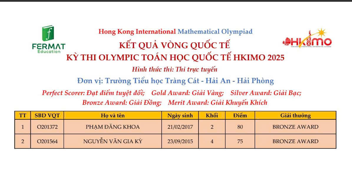 Trong không khí phấn khởi chào mừng năm học mới 2025 – 2026, thầy trò Trường Tiểu học Tràng Cát vui mừng đón nhận tin vui từ các kỳ thi Toán học quốc tế:
