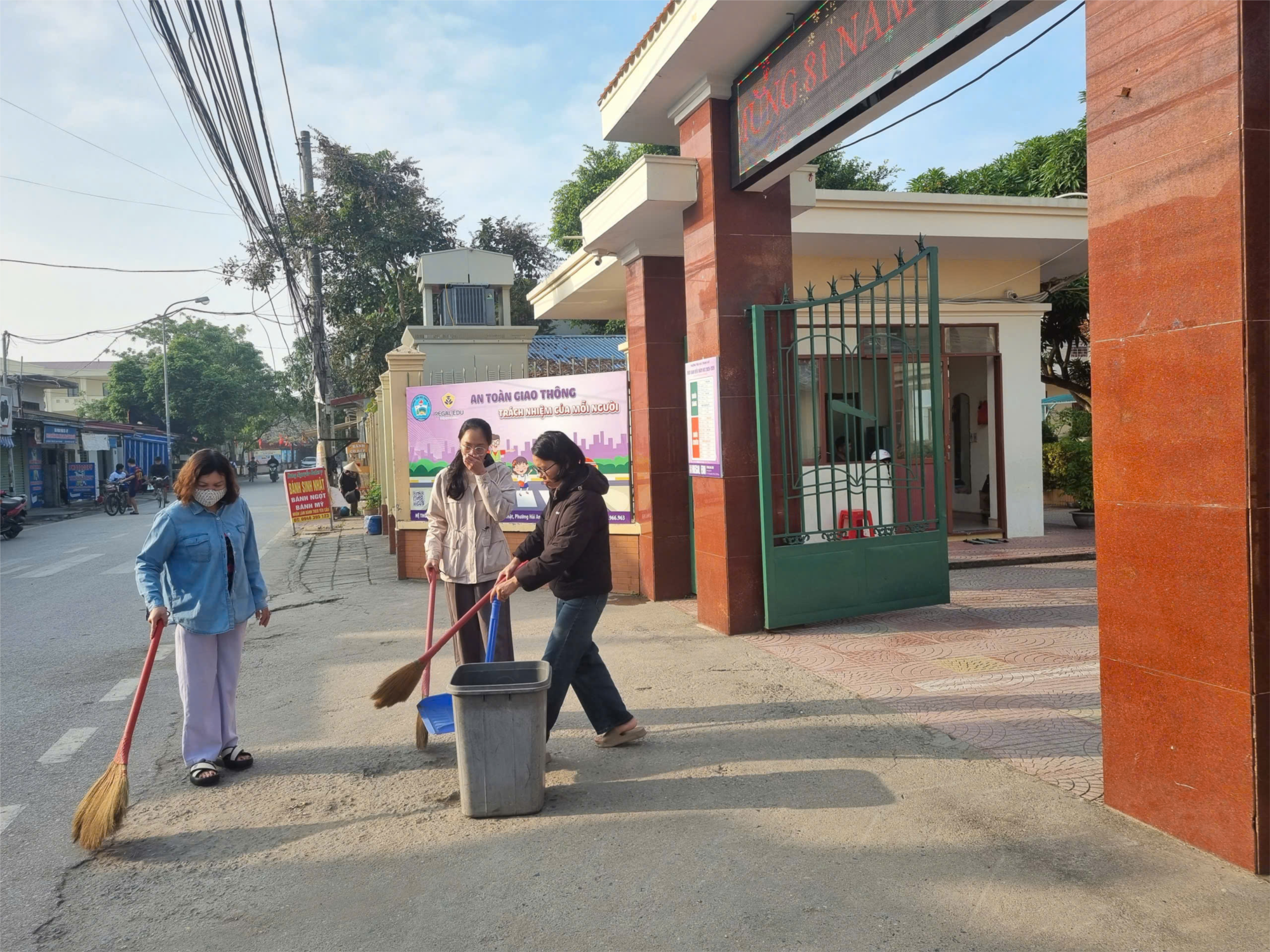 Từng nhóm giáo viên tích cực quét dọn sân trường, làm sạch lối đi, chăm sóc cây xanh, bồn hoa và thu gom rác tại các khu vực xung quanh. Những hành động tuy nhỏ nhưng mang ý nghĩa lớn, góp phần tạo nên không gian học tập gọn gàng, trong lành và thân thiện.