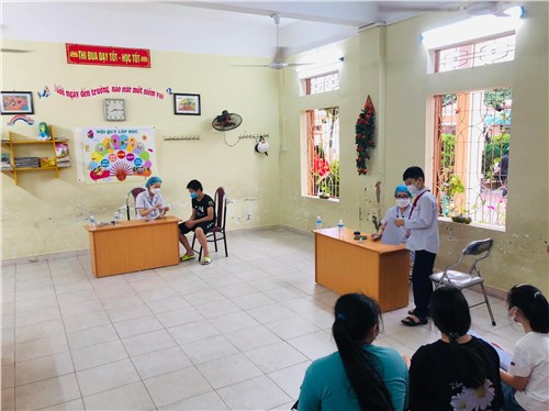 - Trước khi vào tiêm, các em đã được các y, bác sỹ đo thân nhiệt, hướng dẫn rửa tay sát khuẩn sau đó di chuyển, xếp hàng đảm bảo khoảng cách và chờ gọi tên. Trong quá trình triển khai tiêm phòng, lực lượng cán bộ y tế và các lực lượng tình nguyện vừa tiêm vừa tuyên truyền để tạo tâm lý thoải mái cho các trẻ.